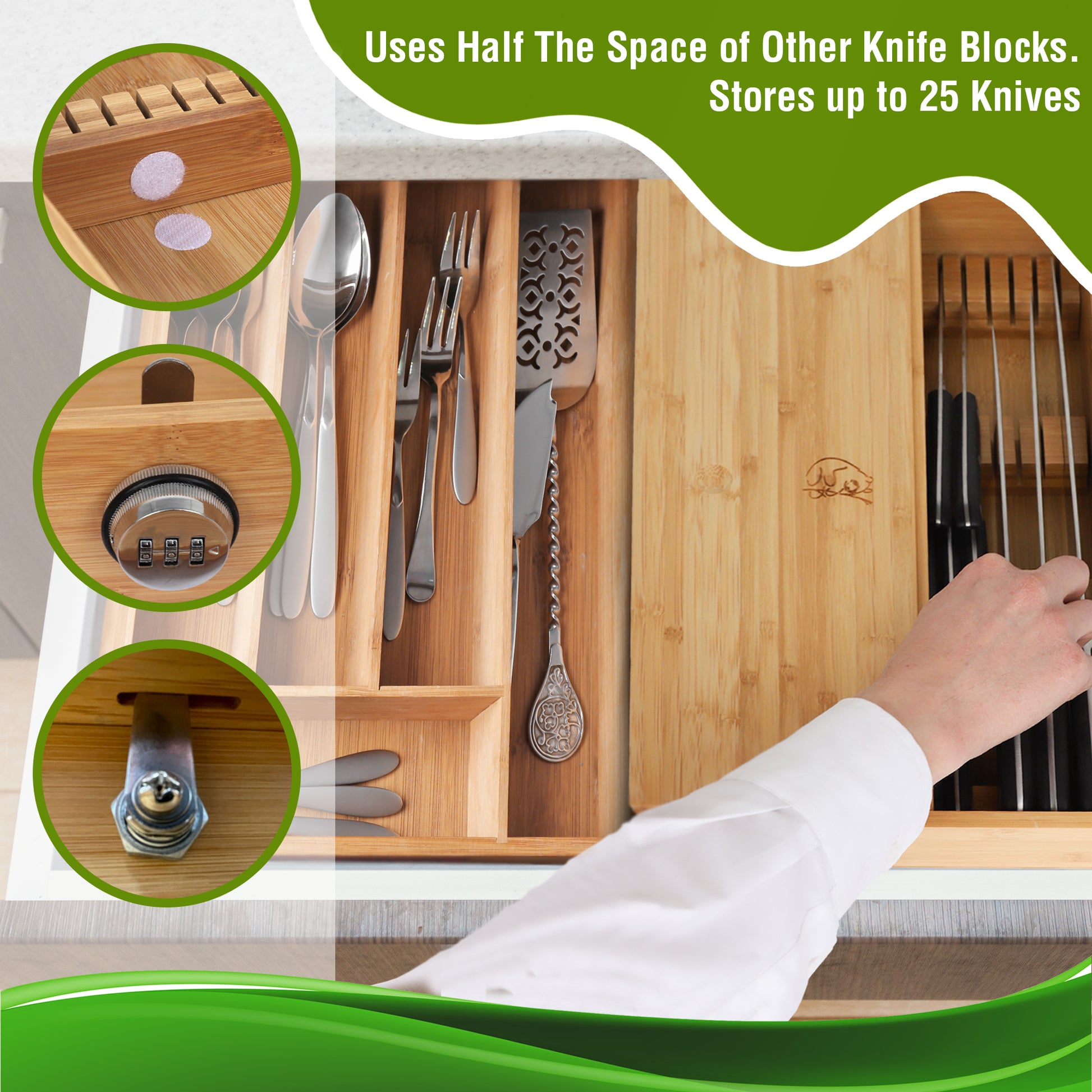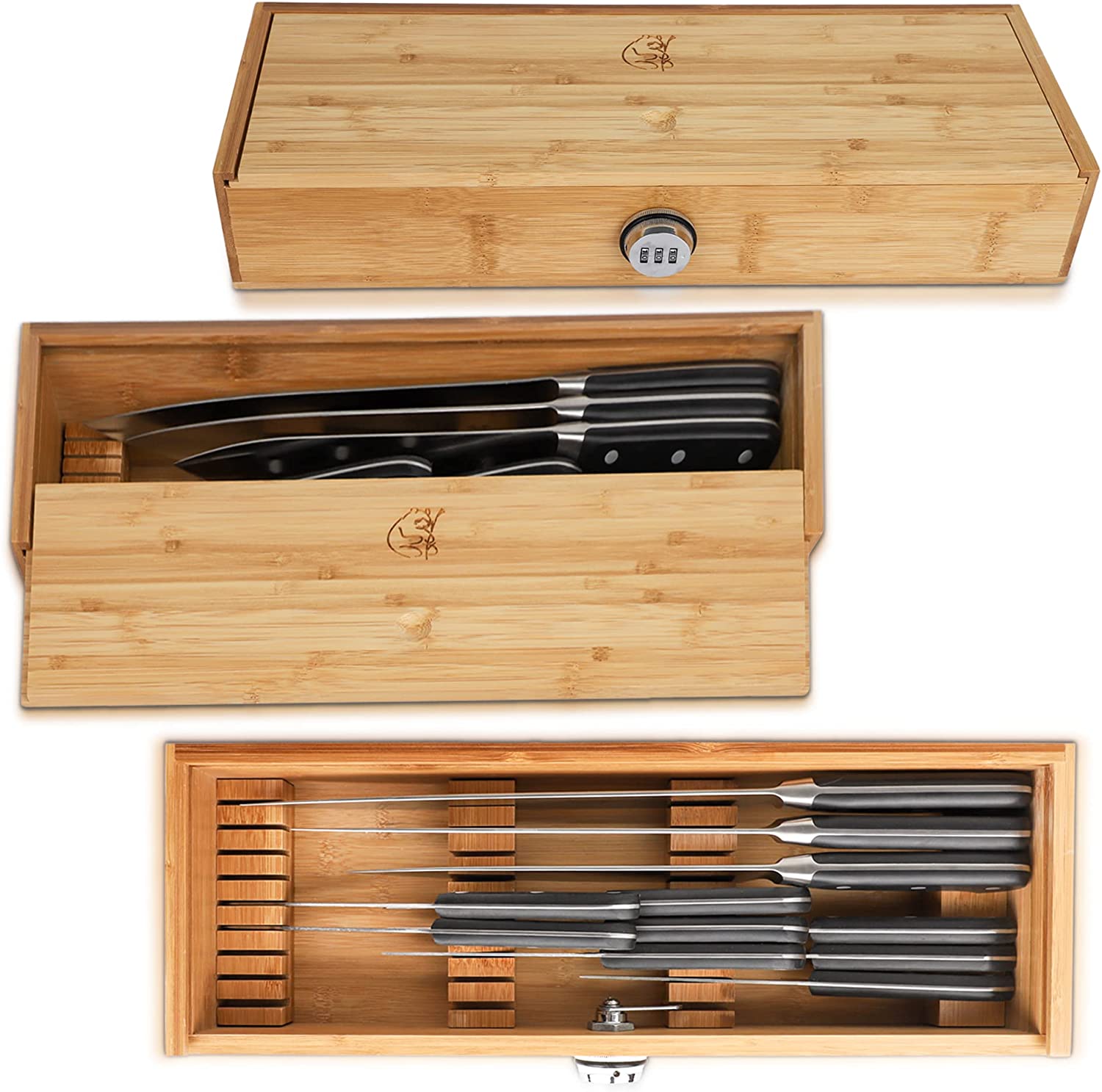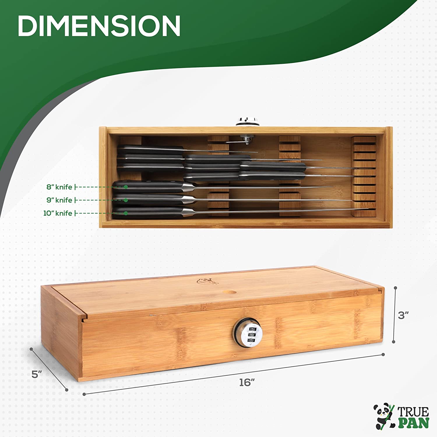 - KEEP YOUR KNIVES ORGANIZED & SAFE : This Box/Organizer is designed to keep sharp knives safe & Organized. No more worries of kids accessing dangerous knives or jammed drawers shooting knives out. Box can also be used to storage safely items like, scissors, batteries, glue, medication, etc.